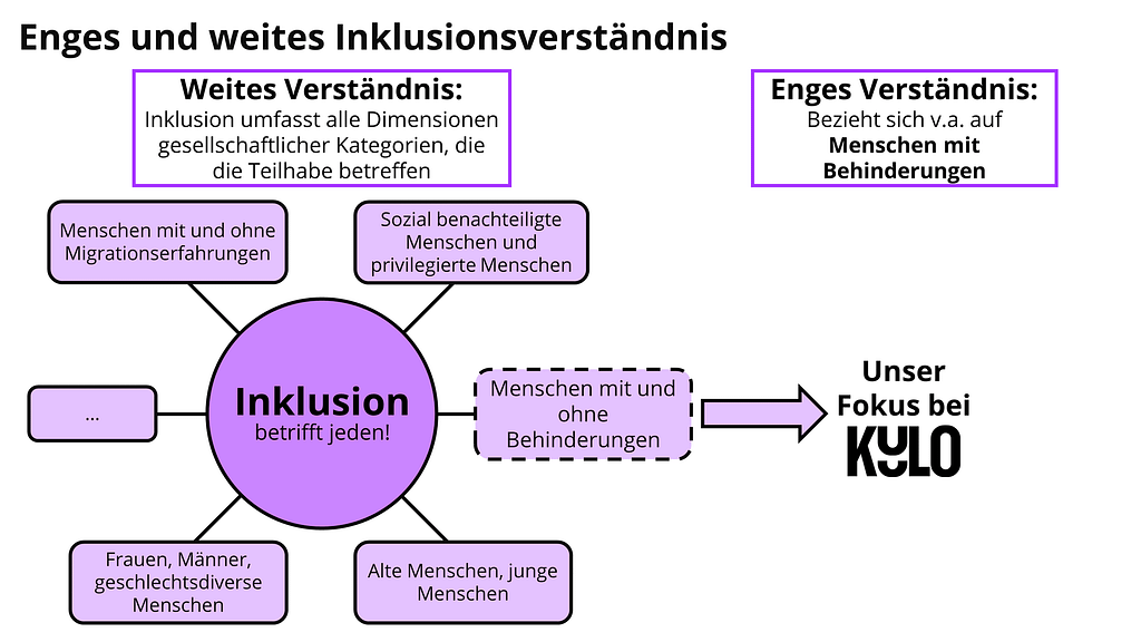 Du hast dich eben mit deinen eigenen Merkmalen und Normvorstellungen auseinander gesetzt und diese reflektiert. Das weite Inklusionsverständnis umfasst alle Dimensionen gesellschaftlicher Kategorien, die die Teilhabe betreffen und damit jede Person in irgendeiner Form. Das enge Inklusionsverständnis bezieht sich auf Menschen mit Behinderungen. Unser Fokus bei KuLO im Baustein Barrierefreiheit sind ebenfalls die Menschen mit Behinderungen. Somit beziehen wir uns auf das enge Inklusionsverständnis.